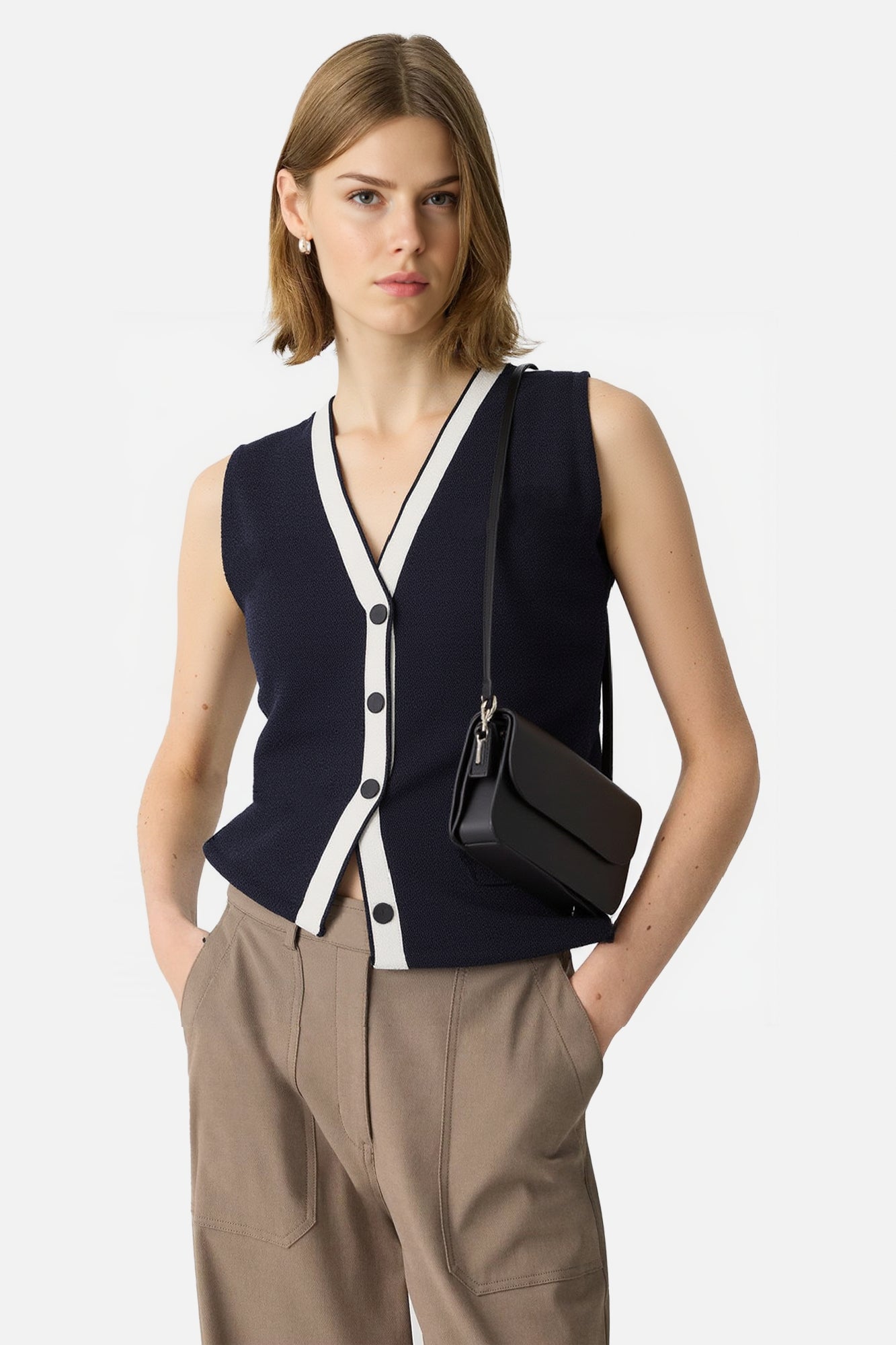 -Sophisticated navy knit vest with striking white contrast trim along V-neckline and hem.