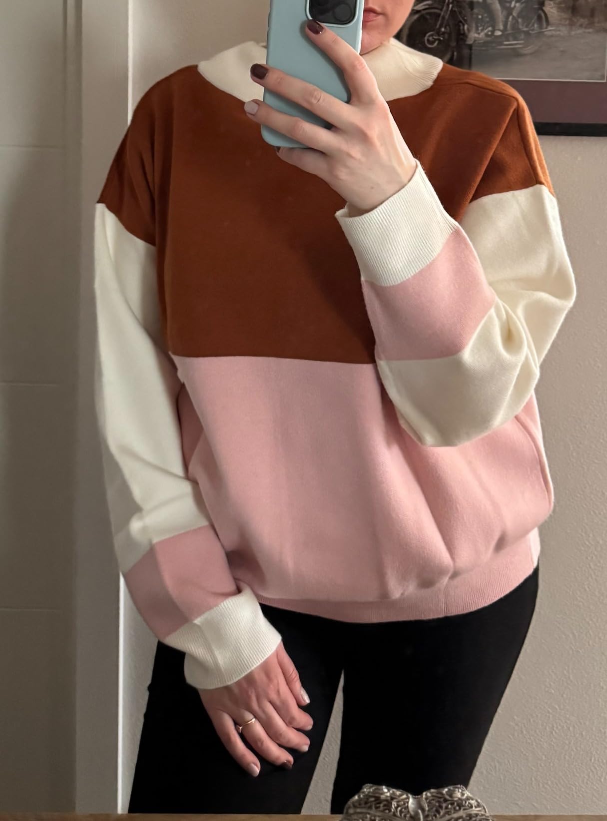 I was very surprised by the quality and fit of this sweater. I got a large size in the brown-pink color. I wear it all the time, and I'm so pleased that it works well with my height and body type! I'm 5'10" and about 180lbs (a size 10 or so) and this fits great! It feels much more expensive than its actual price. I highly recommend!