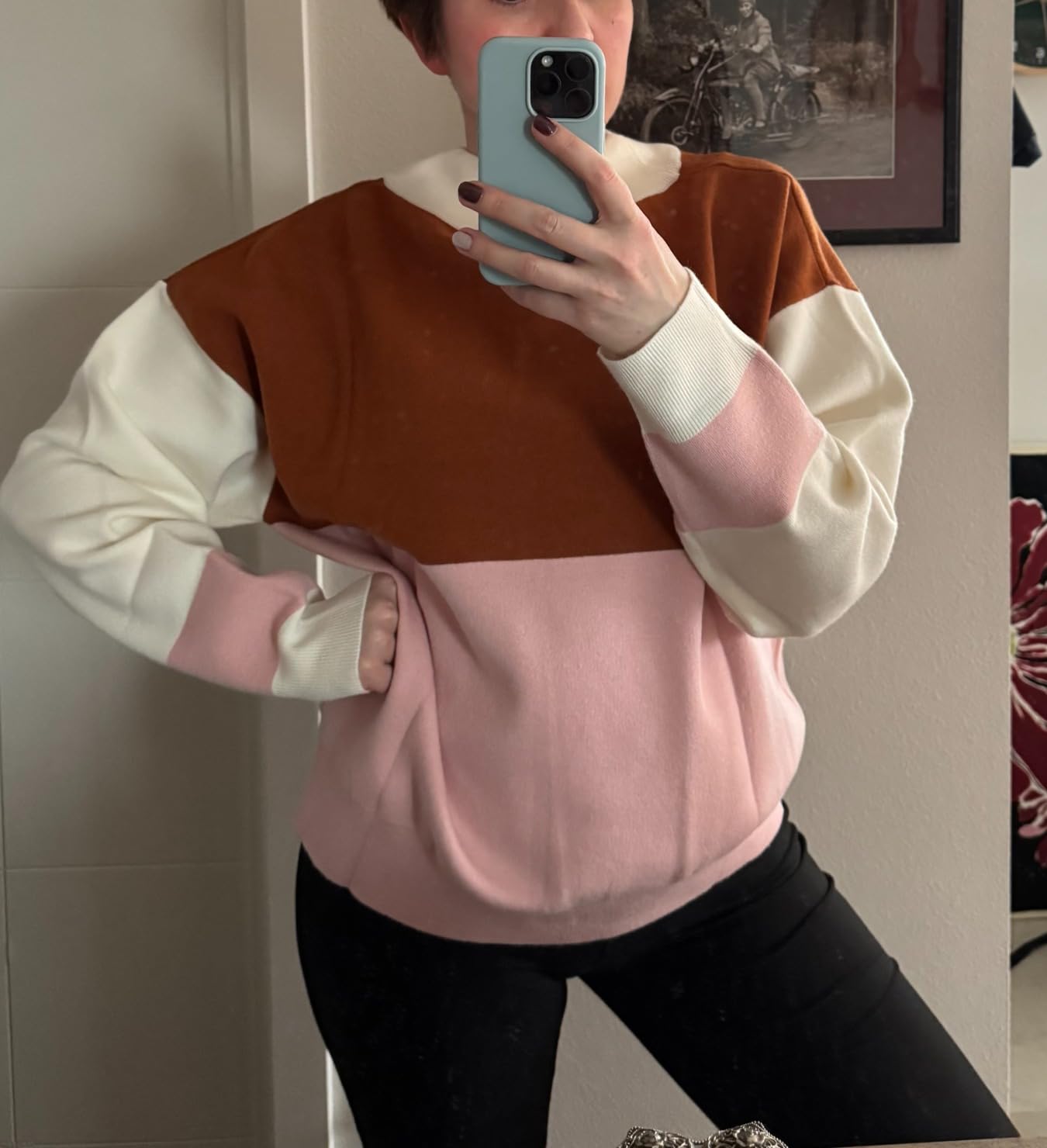 This sweater is super soft and comfortable.It is loose so don’t size up but it’s also so soft that you will want to wear it all the time.It’s thick enough for the cold days and looks great with jeans dress or any pants.The colors and design make it look fancy as well.