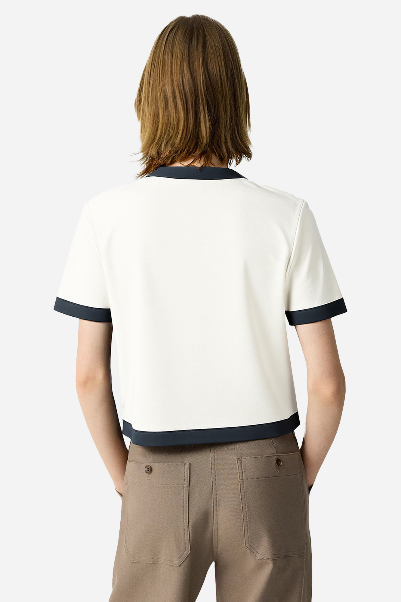-Sophisticated crew neckline with contrasting trim creates a polished, structured look.