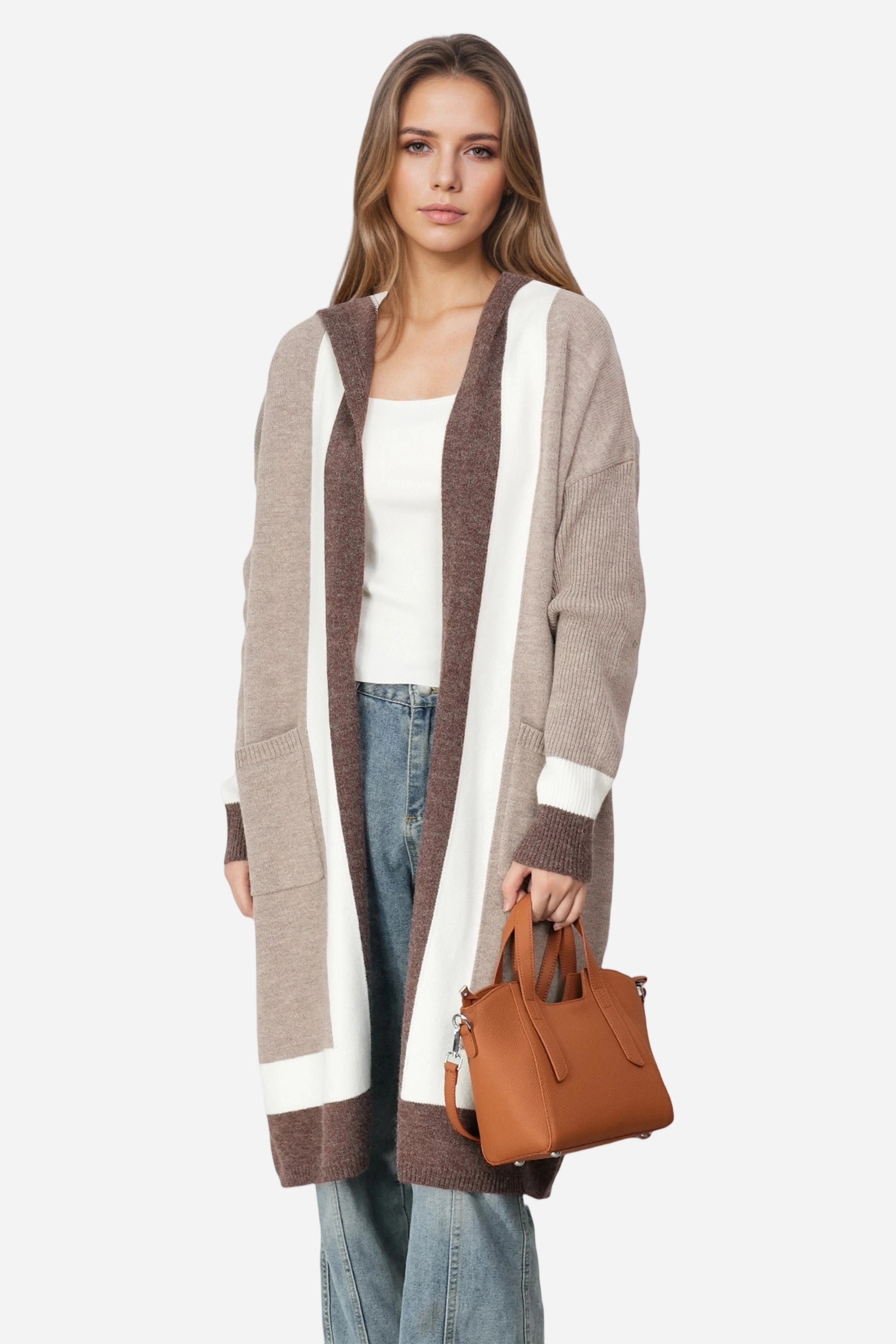 This sweater is too big for me to wear out as a fashionable outfit b/c it's a size S. I'm 5'4," 99lbs, 34 C/D bra, so I need an XXS to XS. However, I still love this cardigan to wear around my house! We keep it cold year-round, so I throw it on over loungewear to work from home & do my mom/wife duties as well. It does slip down my shoulders a lot, but I just shrug it back up. I think the heaviness of the hood is what pulls it down. The teal color is pretty, the pockets are large & helpful, & it comes down to the middle of my kneecaps. I would recommend it, even if it's not my cup of tea for fashion as it's comfortable & so useful!