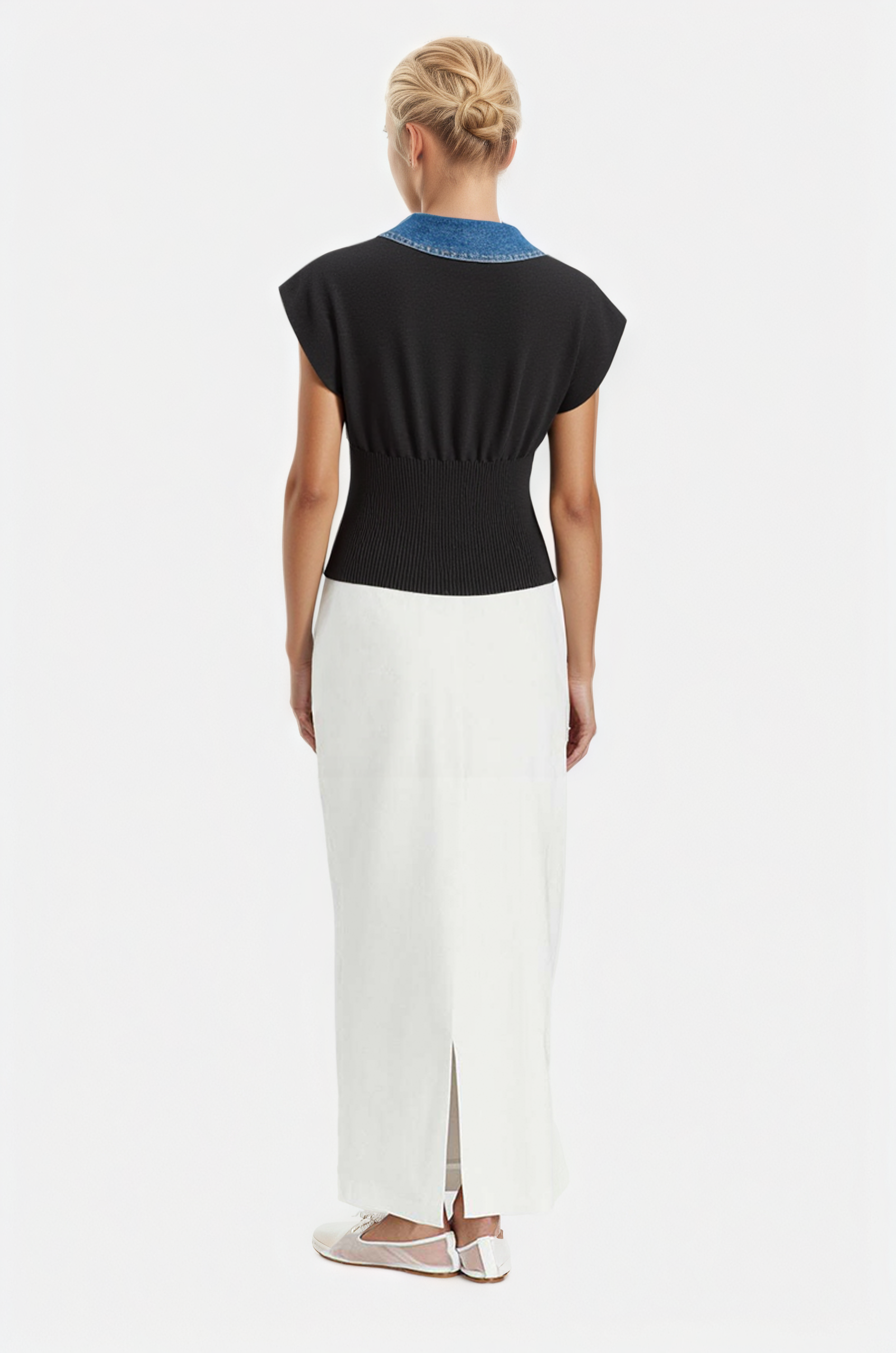 -Innovative hybrid design combines knit body with structured denim collar for unique texture play.