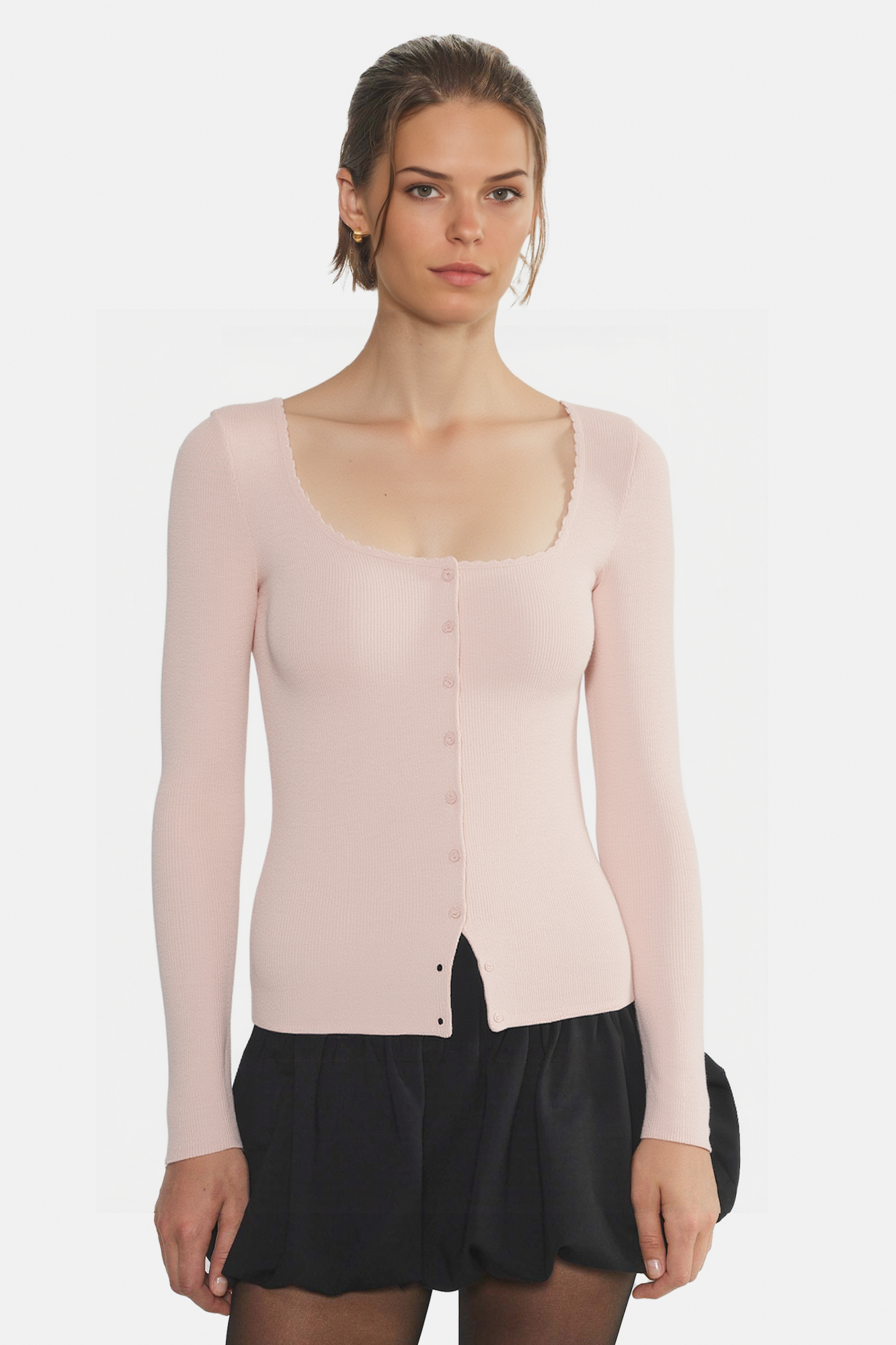 -Delicate scoop neckline with subtle scalloped edge detailing for a feminine, romantic silhouette.