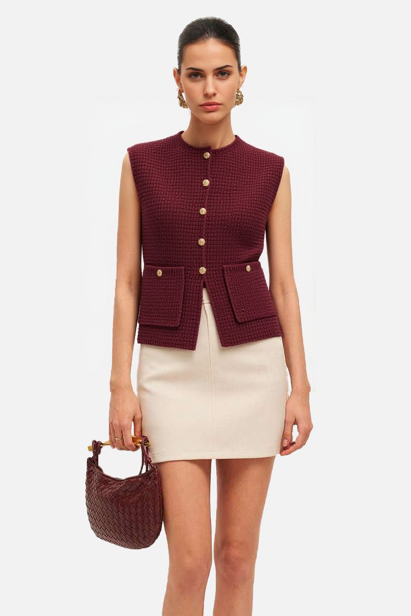-Textured knit vest with elegant button-front closure creates a refined, structured silhouette.